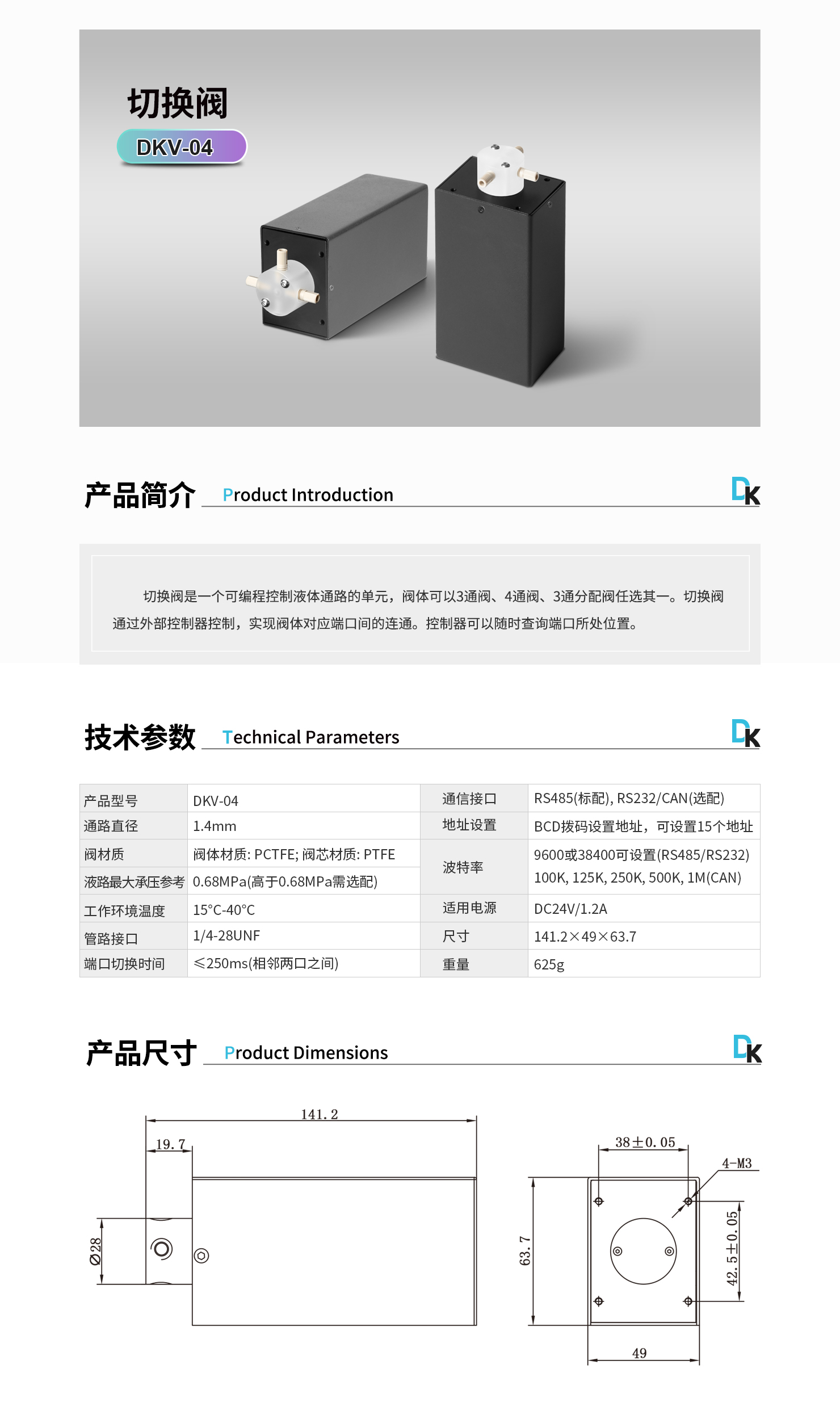 切換閥是一個可編程控制液體通路的單元,閥體可以3通閥、4通閥、3通分配閥任選其一。切換閥通過外部控制器控制,實現(xiàn)閥體對應端口間的連通??刂破骺梢噪S時查詢端口所處位置。