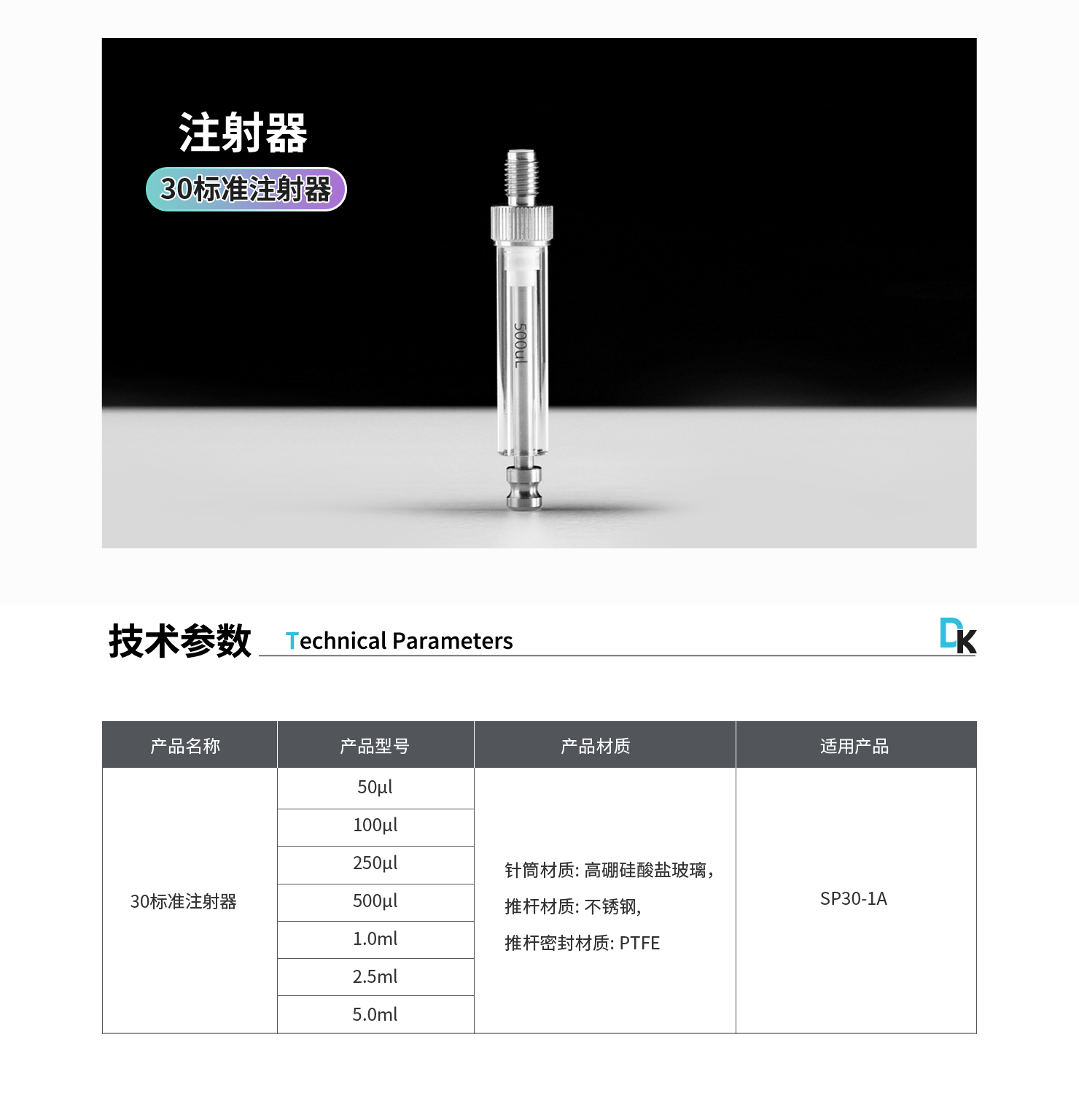 注射器材質(zhì):針筒材質(zhì): 高硼硅酸鹽玻璃, 推桿材質(zhì): 不銹鋼, 推桿密封材質(zhì): PTFE