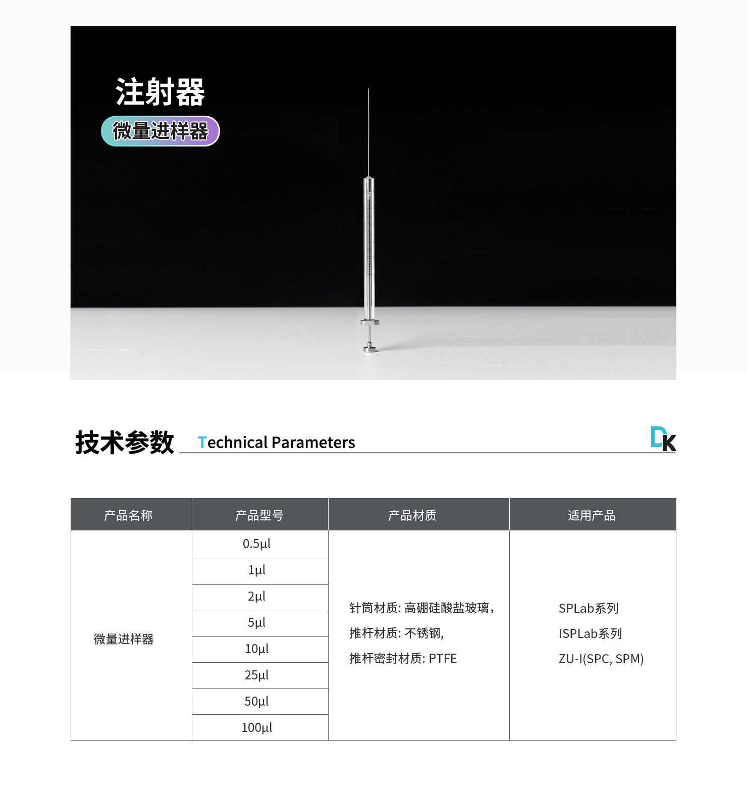 注射器材質(zhì):針筒材質(zhì): 高硼硅酸鹽玻璃, 推桿材質(zhì): 不銹鋼, 推桿密封材質(zhì): PTFE